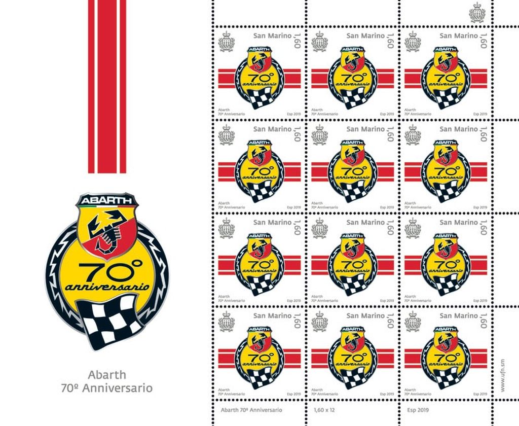 Abarth kończy 70 lat i z okazji Abarth Days 2019, międzynarodowego zlotu wszystkich fanów Abartha, zostanie wyemitowany jubileuszowy znaczek upamiętniający tę ważną rocznicę marki spod znaku Skorpiona.