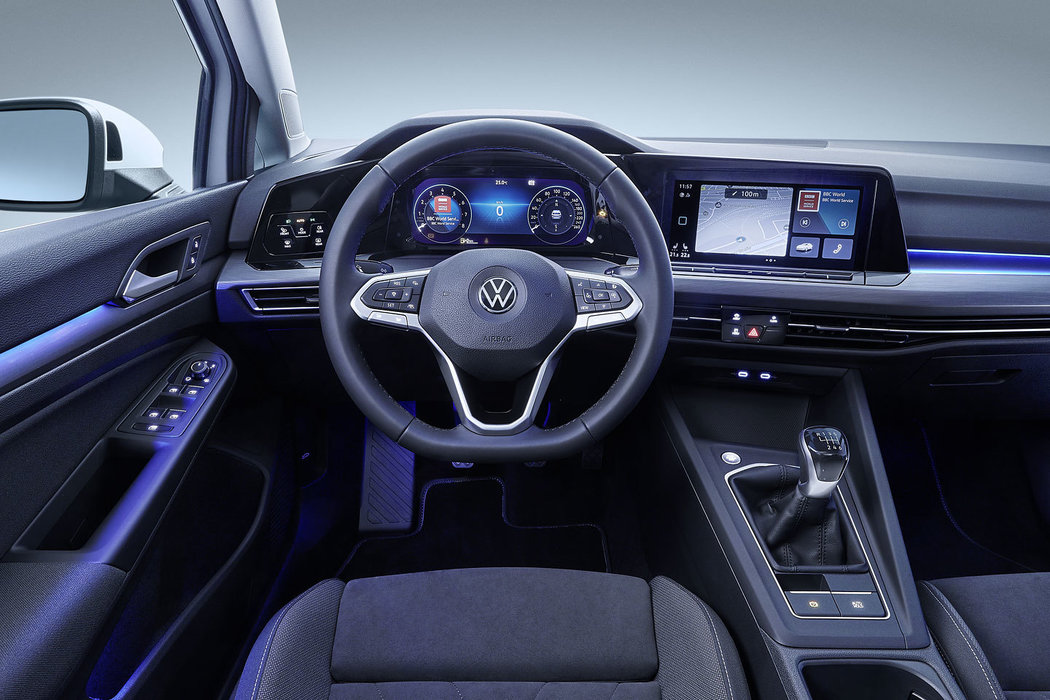 Wnętrze nowego Golfa doczekało się wielu zmian i stało się bardziej nowoczesne. Nowe wskaźniki i systemy multimedialne działające online łączą się tworząc jeden, znajdujący się na tej samej osi cyfrowy kokpit; współgrają z nim dotykowe pola i ekrany. Zakres informacji dostarczanych kierowcy można poszerzyć korzystając z opcjonalnego wyświetlacza Head-up. Dotykowe pola i możliwość sterowania różnymi funkcjami przy pomocy komend głosowych sprawiają, że obsługa nowego Golfa jest naturalna i intuicyjna. Volkswagen sięgnął po najnowsze rozwiązania w zakresie cyfrowych elementów obsługi i wskaźników, by na jeszcze wyższy poziom podnieść możliwości interakcji między człowiekiem a maszyną. Jednostka online connectivity unit (OCU) stosowana seryjnie i wyposażona w kartę eSIM współdziała z systemami usług internetowych zawartych w We Connect i We Connect Plus.
