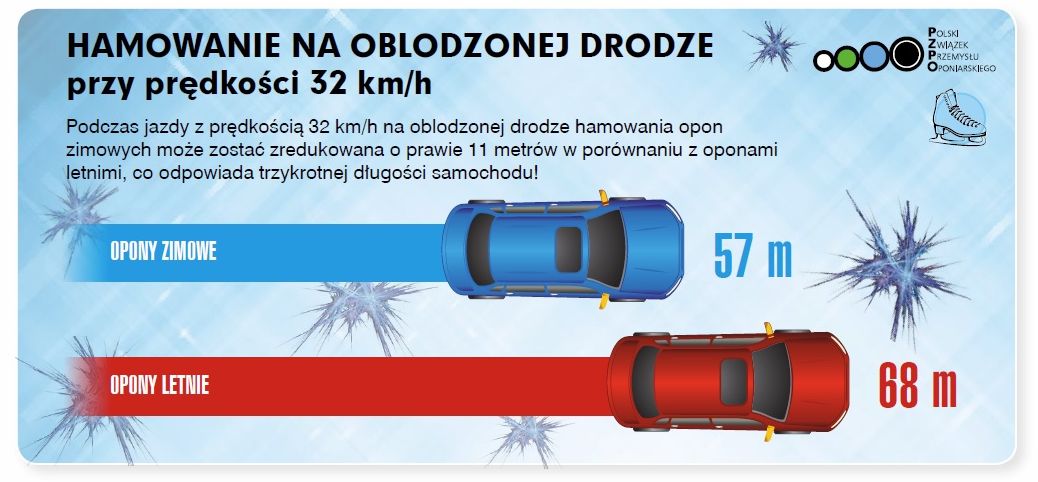 Niebezpiecznym mitem jest wiara w to, że ze zmianą opon letnich na zimowe powinno się czekać aż spadnie śnieg. Hamując na mokrej drodze z 80 km/h nawet przy +10ºC zimówki poradzą sobie lepiej niż opony letnie – w takich warunkach samochód na oponach zimowych zatrzyma się 3 metry wcześniej. Co więcej – w momencie, kiedy auto na zimówkach już się zatrzyma, samochód na oponach letnich będzie jeszcze jechał z prędkością 32 km/h. Osiągi opon letnich pogarszają się wraz ze spadkiem temperatury – zmień opony na zimowe już wtedy, gdy rano temperatura regularnie spada poniżej +7ºC!