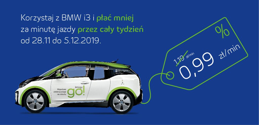 Black Friday ekologicznie? Z innogy go! można cały tydzień wozić zakupy bezemisyjnym autem na preferencyjnych warunkach: stawka za minutę jazdy wynosi 0,99 zł/min!