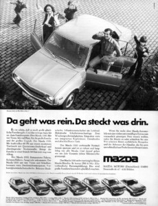 A wszystko zaczęło się od pierwszego masowo produkowanego samochodu osobowego Mazdy. Wprowadzona na rynek w maju 1960 r., sprytnie zaprojektowana Mazda R360 o długości 2,98 m, mogła pomieścić cztery osoby pomimo swoich niewielkich rozmiarów. Dwudrzwiowe coupé dało dotychczasowemu producentowi wyłącznie pojazdów ciężarowych solidny start na rozwijającym się wówczas japońskim rynku samochodów osobowych, a w 1960 r. zapewniło dominację w tym segmencie. W nadchodzących latach i dekadach pojawi się długa lista atrakcyjnych, przyjaznych podróżującym rodzinom modeli.