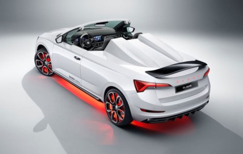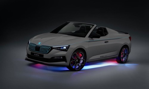 Nadwozie pokryto lakierem Crystal Blue z efektem perłowym. Diody LED umieszczone pod progami bocznymi i za felgami aluminiowymi, zapewniają wyraziste zewnętrzne oświetlenie w kolorach niebieskim, czerwonym oraz białym. Podświetlany napis Skoda pełni funkcję kierunkowskazu, światła hamowania, a także światła cofania. Plakietka umieszczona na przednich drzwiach przypomina o obchodzonych w tym roku 125 urodzinach marki.