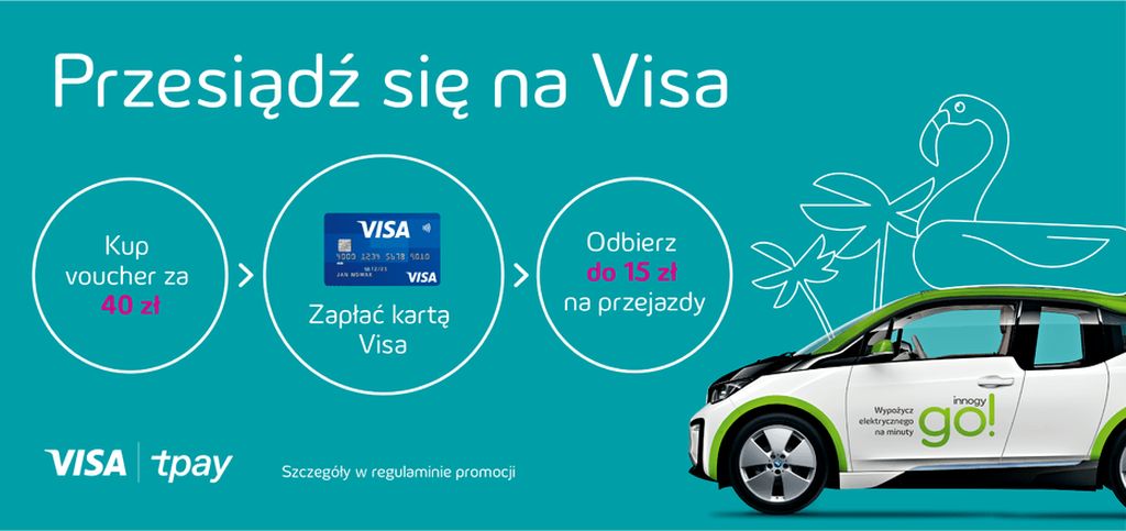 Nową ofertę dla użytkowników carsharingu elektrycznego stworzyły: innogy go! wraz z Visa i Tpay. Od teraz w aplikacji innogy go! będzie można zakupić promocyjny Voucher Visa, za którego zakup użytkownik otrzyma zwrot części poniesionych kosztów, w postaci vouchera na kolejne przejazdy.