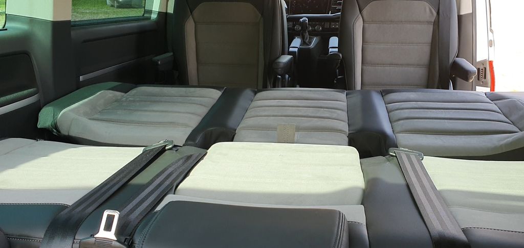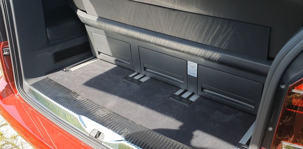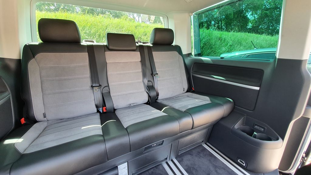 Multivan to przede wszystkim dość luksusowy środek transportu osób. W tym przypadku dokładnie siedmiu łącznie z kierowcą. We wnętrzu znajdowały się 4 pojedyncze fotele, w tym dwa obracane, i 3-sobowa kanapa, którą można rozłożyć na płasko, tworząc w ten sposób coś w rodzaju łóżka. Oczywiście wszystko zostało zamontowane na szynach, co umożliwia dowolne przesuwanie, a nawet wymontowanie tego co zbędne. Pasażerowie mają do dyspozycji stolik, który można rozłożyć i dopasować indywidualnie do każdego miejsca, ustawić pośrodku lub całkowicie złożyć, a nawet wyjąć. Trzeba za niego dopłacić 1470 zł netto. Oczywiście można korzystać z indywidualnego nawiewu, ogrzewania (postojowe z programatorem to koszt 8430 zł netto) i oświetlenia. Z tyłu są też specjalne kieszenie na napoje, dwa dodatkowe gniazda USB typu C oraz po jednym 12-voltowym przy kanapie i w bagażniku. Komfort podróżowania podnoszą przyciemniane szyby i dodatkowe rolety. Do środka prowadzą drzwi przesuwne z prawej i lewej strony, otwierane elektrycznie ze wspomaganiem domykania, za co trzeba dodatkowo zapłacić 6590 zł netto. Elektrycznie otwierana klapa z tyłu to kolejne 2520 zł netto, ale jest dość duża i warto za ten komfort dopłacić.