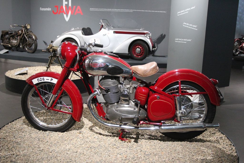 Wśród prezentowanych motocykli możemy podziwiać międzywojenne prototypy od początku lat trzydziestych XX wieku, a także z tajnych prac w okresie okupacji. Wśród wyczynowych motocykli jest też Jawa 350 typ 673, na której z dużymi sukcesami startował František Šťastný.
