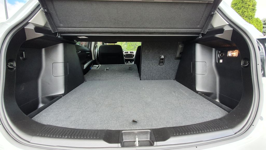 Bagażnik jest typowej wielkości jak na auta w tym segmencie – mieści 430 l. Warto jednak podkreślić, że zastosowano w nim sporo praktycznych rozwiązań. Mamy do dyspozycji dwa poziomy, z możliwością wygodnego zablokowania półki na czas pakowania rzeczy do środka. Po bokach są wygodne kieszenie, które można w razie potrzeby rozmontować, poszerzając dostępną przestrzeń. W środku jest również gniazdo 12-voltowe, dwa zaczepy do mocowania siatki i uchwyt na torbę. Jeżeli chcemy przewieźć coś dłuższego, większego, można w łatwy sposób złożyć oparcie tylnej kanapy, które jest dzielone 60:40. Gdy złożymy całe oparcie, mamy do dyspozycji 875 l. Maksymalna pojemność bagażnika za pierwszym rzędem siedzeń wynosi 1269 l.