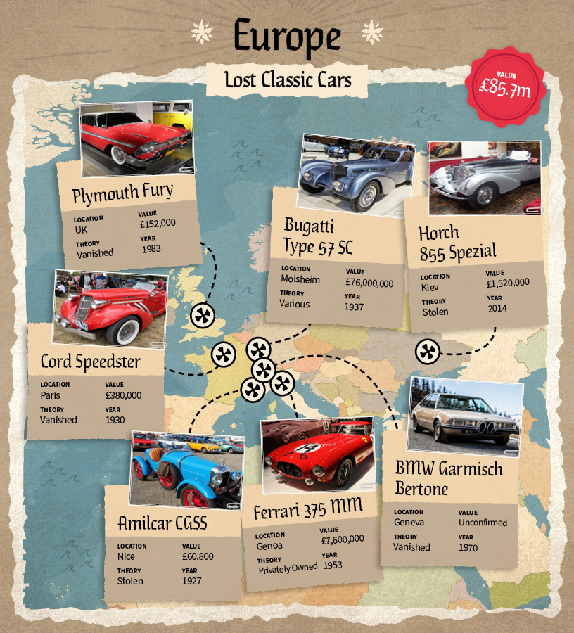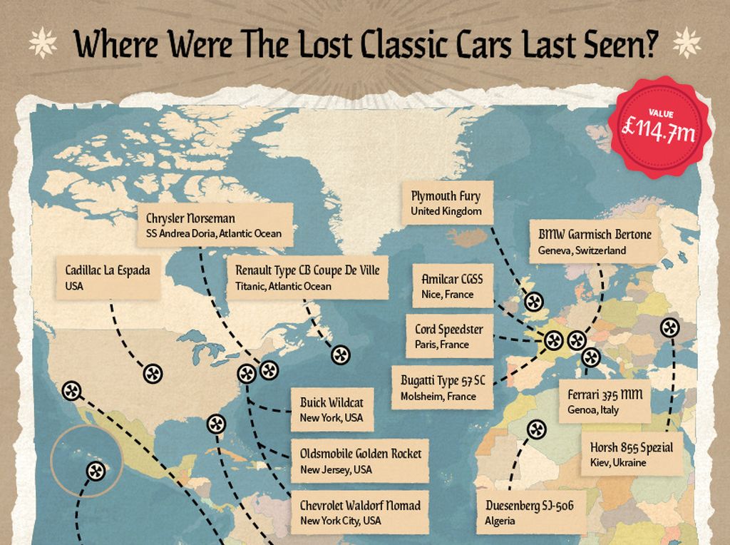 Samochody giną nie od dzisiaj. Często jednak te najdroższe przepadają gdzieś bez wieści. Brytyjska spółka Select Car Leasing stworzyła mapę najbardziej znanych przypadków, które wydarzyły się w latach 1912-2014.