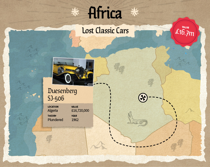 Drugim najcenniejszym autem na tej liście jest Duesenberg SJ-506 z lat trzydziestych minionego stulecia. Pojazd napędzany ośmiocylindrowym silnikiem z kompresorem w 1934 roku został zaprezentowany w Paryżu, skąd trafił do Emila Beghaina i w następnym roku pojawił się na starcie legendarnego wyścigu Le Mans. Kolejnym etapem była Algieria, z której właściciel i jego cacko musieli się wyprowadzić w 1962 roku, gdy ogłoszono niezależność od Francji. Jaki był ich dalszy los, tego nie wiemy.