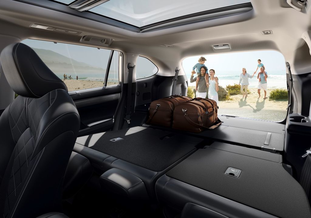 Toyota Highlander to jeden z największych SUV-ów dostępnych w Polsce o długości 4 950 mm i bardzo przestronnym wnętrzu oraz dużych możliwościach transportowych – zarówno za sprawą pojemnego bagażnika, jak i możliwości ciągnięcia przyczepy o masie do 2 ton. Przy złożonym trzecim rzędzie siedzeń bagażnik do wysokości rolety mieści 658 l, a po złożeniu drugiego rzędu powstaje przestrzeń bagażowa o pojemności aż 1 909 l (do sufitu) oraz płaska podłoga, na której można rozłożyć dwuosobowy materac. To sprawia, że hybrydowy Highlander 4×4 jest idealnym samochodem rekreacyjnym, który podczas podróży zapewnia przestrzeń i komfort oraz duże możliwości terenowe.