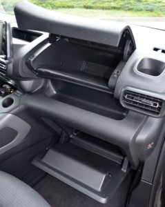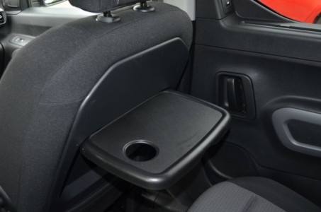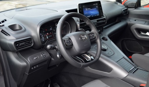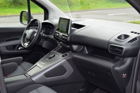 Miejsce za kierownicą w Proace City można zająć wygodnie, dostosowując zarówno pozycję fotela, jak i położenie kierownicy,którą regulujemy w dwóch płaszczyznach.W tym wypadku zarówno fotel kierowcy,jak i pasażera były podgrzewane. Wnętrze jest tak samo funkcjonalne i wygląda z grubsza prawie identycznie jak u pozostałych bliźniaków. Wyróżnikiem jest m.in. kierownica, która w tym przypadku ma bardziej tradycyjny kształt, ale ścięty u dołu, co ułatwia wsiadanie i wysiadanie z samochodu. Inaczej też wygląda obudowa zegarów, choć oprogramowanie jest już identyczne. Kierowca w tej wersji ma przed oczami wyświetlacz przezierny typu HUD (Head-up Display), na którym może śledzić aktualną prędkość i ograniczenia prędkości, nie odrywając wzroku od drogi.