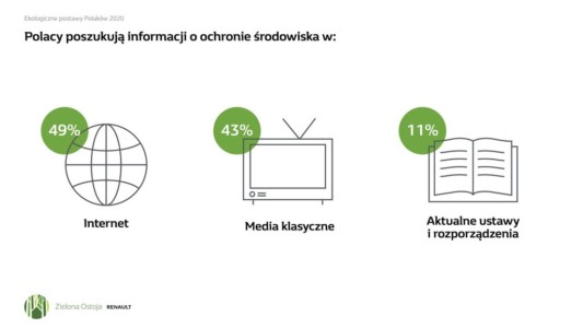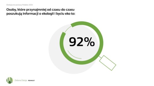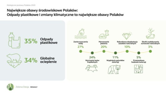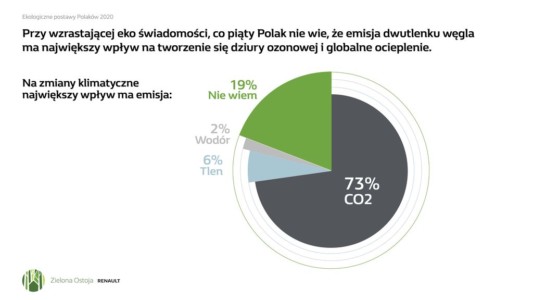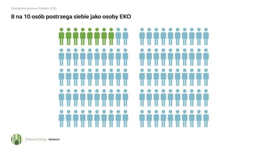 Badanie Instytutu GFK „Ekologiczne postawy Polaków” przeprowadzone pod koniec 2020 roku na zlecenie Grupy Renault pokazało, że w większości zdajemy sobie sprawę z wagi działań ekologicznych i chcemy działać, ale potrzebujemy wiedzy. Aż 8 na 10 osób postrzega siebie jako „osoby eko”, a 85% badanych ma świadomość, że przez swoje zachowanie może przyczynić się do ochrony środowiska. Przy wzrastającej ekoświadomości nadal mamy jednak problemy z określeniem przyczyn zmian klimatycznych.