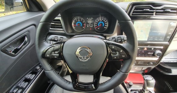 Miejsce można wygodnie zająć dzięki sporej regulacji kierownicy i fotela. Fotel kierowcy jest bardzo wygodny, dobrze trzyma i sprawia, że nie czujemy zmęczenia podczas dłuższej jazdy. Jednak podłokietnik nie ma regulacji i nie każdy będzie mógł z niego skorzystać. Wielofunkcyjna kierownica dobrze leży w dłoniach, z jej poziomu możemy obsługiwać system multimedialny, komputer pokładowy oraz tempomat. Zarówno fotele, jak i koło kierownicy w tej wersji były podgrzewane, co docenią użytkownicy szczególnie tej zimy. Silnik uruchamia się za pomocą przycisku – bezkluczykowo.