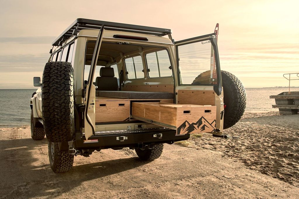 Wymóg jakości wykonania i estetyki był bardzo ważny dla właściciela wyprawowej Toyoty, a jego dopełnieniem są specjalne grafiki i niestandardowe kwadratowe klamki w zabudowie, które idealnie komponują się z klasycznymi kształtami nadwozia Land Cruisera serii 70.