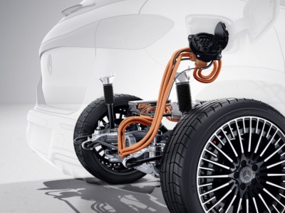 Mercedes EQA ma duży, ponad 20-centymetrowy prześwit. Wyposażono go w akumulator litowo-jonowy o pojemności 66,5 kWh, zlokalizowany pod kabiną pasażerską, pośrodku pojazdu. Najniższym punktem podwozia są jednak dolne krawędzie osłon progów, przebiegające nieco poniżej spodu akumulatora.