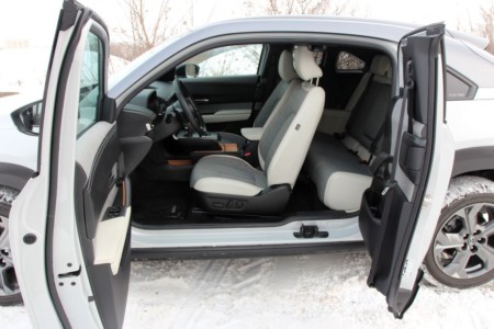 Przy bliższym poznaniu Mazdy MX-30 okazuje się, że drzwi typu freestyle jednak ułatwiają życie użytkownikom tego modelu. Na pozytywna ocenę zasługują przede wszystkim szerokie kąty otwarcia, a to oznacza łatwiejszy dostęp do wnętrza. Chociaż w drugim rzędzie nie możemy narzekać na nadmiar miejsca, to jednak wsiąść się tam da. Pomogą w tym odchylane oparcia przednich foteli. Na oparciu fotela kierowcy umieszczono przyciski do jego elektrycznego pochylania i przesuwania, a po drugiej stronie mamy już tylko cięgło do pochylenia oparcia.
