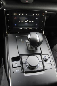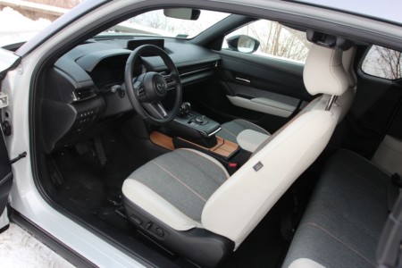 Z całą pewnością elektryczna Mazda nadąża za modą digitalizacji. Kierowca ma przed sobą zegary z cyfrowymi wskaźnikami i fizycznymi wskazówkami oraz w części środkowej mały ekran, który jednak nie jest obsługiwany dotykowo. Do obsługi klimatyzacji przeznaczono oddzielny ekran w dolnej części, który może być obsługiwany dotykowo oraz ma pionowe przyciski do regulacji temperatury. Natomiast system multimedialny obsługiwany jest tradycyjnym pokrętłem, a jego ustawienia mogą być wyświetlone w systemie head-up.