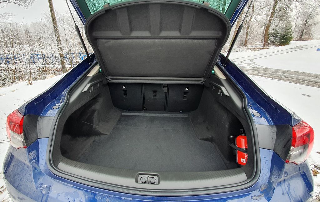 Jeżeli zapragniemy podróżować całą rodziną– to Insignia Grand Sport też się sprawdzi. Do dyspozycji mamy 490 l w bagażniku. Gdyby było za mało, można za naciśnięciem jednego (dwóch) przycisku złożyć oparcia tylnej kanapy, powiększając przestrzeń do 1450 l. Na pochwałę zasługuje też sposób otwierania pokrywy silnika – dzięki temu, że zastosowano siłowniki, sama się unosi i nie sprawia kłopotu.