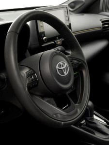 We wnętrzu Yarisa Cross Adventure charakter auta wyrażony został za pomocą detali wykończonych lakierem Piano Black oraz czarnej podsufitki. Siedzenia o dobrym trzymaniu bocznym wykonano ze skóry ekologicznej i są wykończone zgodnie z linią tej wersji, a przez tył, panel ekranu dotykowego i drzwi biegnie dekoracyjna linia w charakterystycznym dla Yarisa Cross kolorze Warm Gold. Kierownica oraz dźwignia zmiany biegów zostały obszyte skórą.