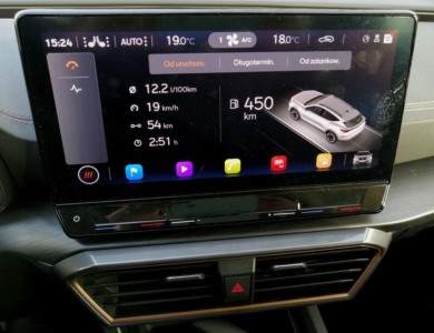 Na desce rozdzielczej wyróżnia się 12-calowy tablet systemu multimedialnego, który może być sterowany dotykowo lub głosem. Radio umożliwia odbiór programów radiowych w formie cyfrowej, a wysokiej jakości dźwięk płynie do pasażerów za pośrednictwem 7 głośników. Szkoda, że głośność i temperatura regulowane są dotykowymi suwakami, które jednak nie są podświetlone. Takie rozwiązanie nie ułatwia kierowcy życia podczas nocnej jazdy.