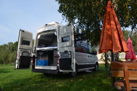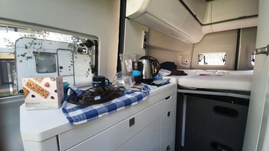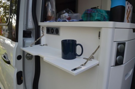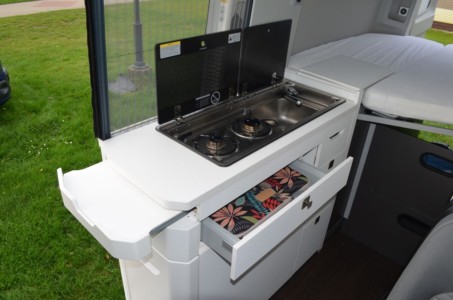 Pełną niezależność zapewnia również aneks kuchenny z dwupalnikową kuchenką, zlewozmywakiem i blatem, który można wydłużyć z trzech stron. Są tam również szuflady do przechowywania naczyń i lodówka z zamrażalnikiem. Gdy jest ciepło, śniadanie można zjeść na zewnątrz, podziwiając widoki. Rozkładana markiza ochroni nas zarówno przed nadmierny słońcem, jak i przed deszczem. W standardzie na wyposażeniu tego kampera jest stolik z krzesłami. W chłodniejsze dni można zasiąść za stołem w środku samochodu, gdzie jest miejsce dla czterech osób.