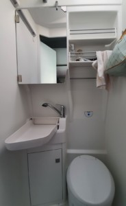 Sporą swobodę daje w pełni wyposażona łazienka, co szczególnie docenimy wiosną i jesienią, gdy na dworze wieczorami bywa chłodno. Odchodzi nam też problem nie zawsze dostępnej ciepłej wody w łazience na kempingu. Do dyspozycji mamy prysznic, toaletę i składaną umywalkę. Wszystko udało się sprytnie umieścić na dość skromnej powierzchni.