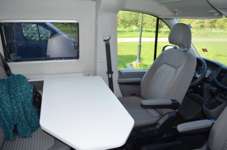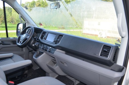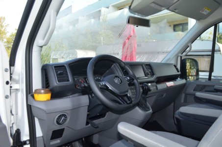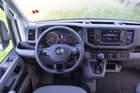 Bazą dla Volkswagena Grand Californii jest Crafter, więc miejsce kierowcy w obu modelach wygląda dokładnie tak samo. Szeroka tablica rozdzielcza z licznymi półkami, schowkami i gniazdami USB i 12-voltowymi, sprawia, że ten samochód jest bardzo praktyczny. Wielofunkcyjna kierownica, pokryta skorą i w tym przypadku podgrzewana, jest regulowana w dwóch płaszczyznach, ale zakres tej regulacji jest umiarkowany – mogłoby być lepiej. Z kierownicy można obsługiwać tempomat adaptacyjny i multimedia. Przed kierowcą jest zestaw przyrządów z dwoma analogowymi zegarami i wyświetlaczem pośrodku, którego widok można dostosować do własnych upodobań. W tym przypadku były zamontowane dwa indywidualne fotele podgrzewane, z podłokietnikami, które można odwrócić na postoju, by wygodnie usiąść np.przy stole. Pomiędzy fotelami zamontowano„luźny” hamulec ręczny, typowy dla kamperów.