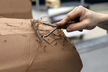Modelarze najpierw rozgrzewają glinę, specjalną mieszankę wosku, oleju, pigmentu i wypełniacza, do temperatury 60°C. Zmiękczony materiał jest następnie nakładany na szkielet nadwozia, by zostać uformowanym w kształt samochodu. Ręce na glinie przekazują energię i modelują głębię każdego detalu powierzchni.