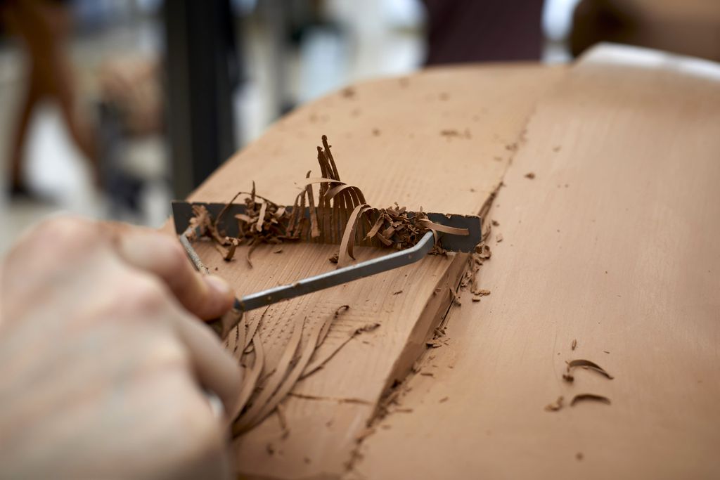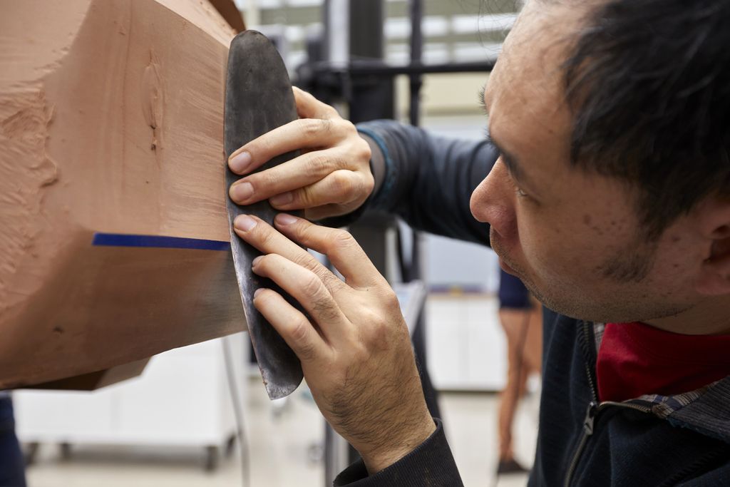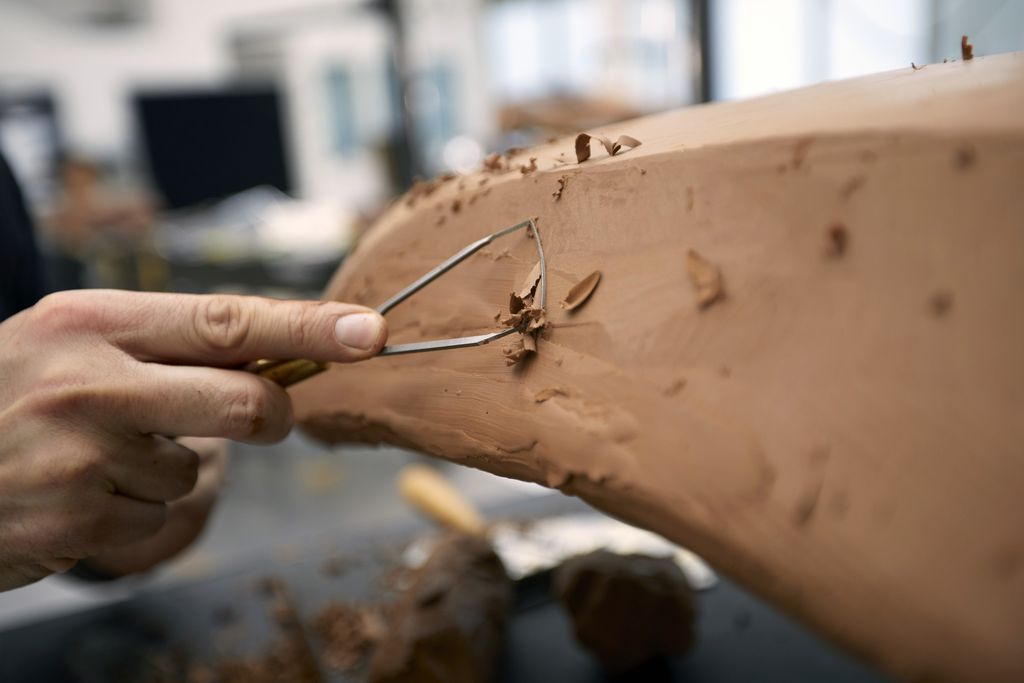 Modelarze najpierw rozgrzewają glinę, specjalną mieszankę wosku, oleju, pigmentu i wypełniacza, do temperatury 60°C. Zmiękczony materiał jest następnie nakładany na szkielet nadwozia, by zostać uformowanym w kształt samochodu. Ręce na glinie przekazują energię i modelują głębię każdego detalu powierzchni.