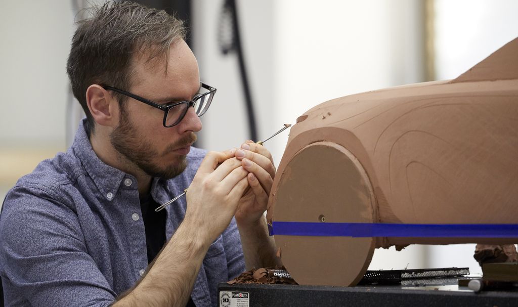 Modelarze najpierw rozgrzewają glinę, specjalną mieszankę wosku, oleju, pigmentu i wypełniacza, do temperatury 60°C. Zmiękczony materiał jest następnie nakładany na szkielet nadwozia, by zostać uformowanym w kształt samochodu. Ręce na glinie przekazują energię i modelują głębię każdego detalu powierzchni.