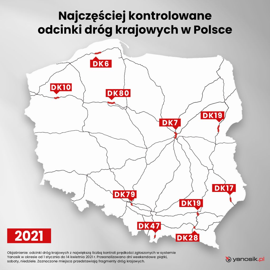 – Dobrze być przygotowanym różnego rodzaju sytuacje na drodze, by bezpiecznie dojechać do celu. Yanosik jest systemem wzajemnego ostrzegania się kierowców o bieżącej sytuacji na drodze. Dzięki niemu mogą się oni informować m.in. o wypadkach, zagrożeniach czy kontrolach prędkości. Tuż przed majówkowymi wyjazdami postanowiliśmy sprawdzić jakie miejsca są najczęściej monitorowane przez policję. W naszej najnowszej analizie na 2021 rok wzięliśmy pod uwagę drogi krajowe z całej Polski i wytypowaliśmy te, na których odnotowanych zostało najwięcej potwierdzonych zgłoszeń o kontroli prędkości na 1 km drogi – wyjaśnia Julia Langa, Yanosik.