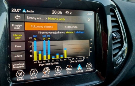 W mieście Compass sprawdza się bardzo dobrze, dzięki kamerze cofania z czujnikami oraz sygnalizacji o ruchu poprzecznym, a w tym przypadku w ramach pakietu Parking była też możliwość automatycznego parkowania. Również podczas miejskich przejażdżek najlepiej możemy zaobserwować, jak hamownie przekłada się na odzysk energii i doładowanie akumulatora. W tym wypadku najlepiej sprawdzi tryb e-Coasting, czyli silnej rekuperacji. Po zdjęciu nogi z pedału przyspieszenia auto silniej wyhamowuje i dzięki temu też odzyskiwana jest większa ilość energii.