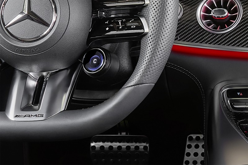 W kokpicie wzrok natychmiast przyciąga standardowa kierownica AMG Performance z charakterystycznymi, podwójnymi ramionami i „płynnie” zintegrowanymi panelami dotykowymi. Okrągłe przełączniki z efektownymi wyświetlaczami pozwalają na intuicyjną obsługę podstawowych funkcji auta i zmianę trybu jazdy bez konieczności odrywania rąk od wieńca. Przyciski na kierownicy pozwalają m.in. wybrać poziom rekuperacji.