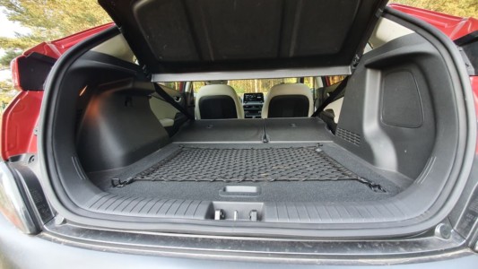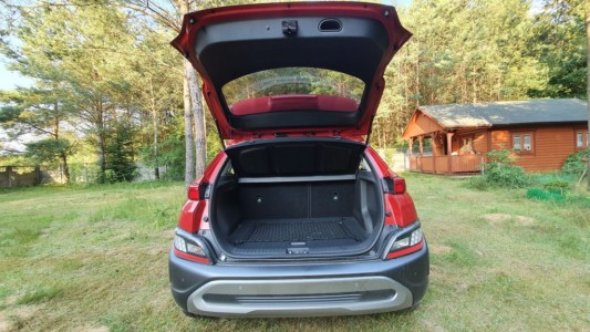 Bagażnik Hyundaia Kona ma regularny kształt, co powinno ułatwić lepsze jego wykorzystanie. Mieszczą się w nim 374 litry, ale w razie potrzeby można go powiększyć, składając oparcie tylnej kanapy. W środku mamy do dyspozycji dwa, a nawet trzy poziomy. Na górze przymocowana jest praktyczna siatka, która sprawi, że drobne rzeczy nie będą się przesuwały. Pod pierwszym poziomem jest płytkie miejsce do przewożenia płaskich, małych przedmiotów. Przegrody zapobiegają przesuwaniu, a tym samym hałasowaniu podczas jazdy. Poniżej jest jeszcze miejsce na koło zapasowe.