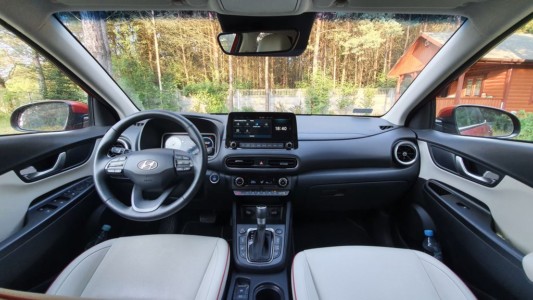 Odpalam silnik i w panice zaczynam szukać, gdzie się to wyłącza? Widać nie jestem aż tak zestresowana. Kona może nas witać np. szumem morza lub odgłosem padającego deszczu i uspakajać tak przez całą drogę. Na szczęście można to wyłączyć. Wnętrze koreańskiego SUV-a świetnie wygląda, a to przede wszystkim za sprawą jasnej tapicerki z czerwonymi przeszyciami. Żeby taką mieć, trzeba zamówić pakiet Leather, który kosztuje 5000 zł, ale efekt jest wart swojej ceny. Testowy egzemplarz miał wersję wyposażenia Premium, wyższa jest już tylko Premium N Line, wówczas skórzaną tapicerkę i wentylowane fotele otrzymamy w cenie.