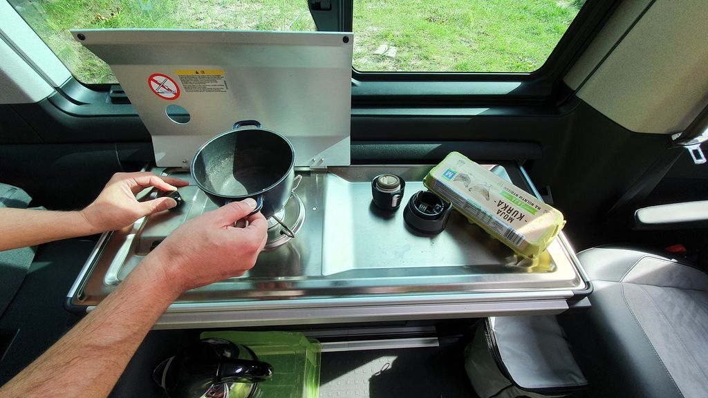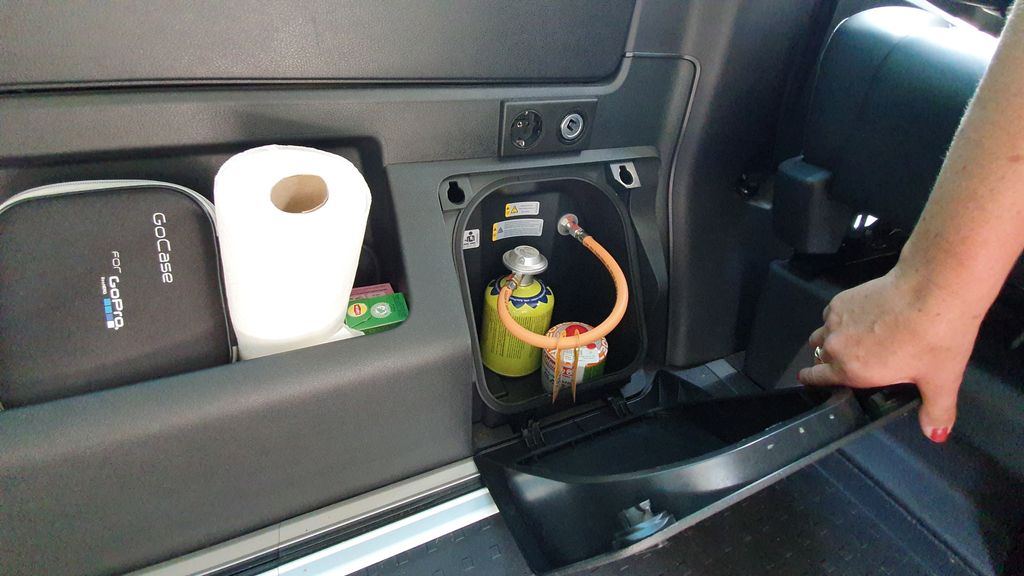 Na kempingu można też korzystać z kuchenki gazowej, która jest sprytnie schowana w ścianie samochodu. Jeżeli nie jest nam potrzebna, nie zabiera praktycznie miejsca i jest niewidoczna. W podobny sposób wykorzystano miejsce w drzwiach przesuwnych – tam umieszczono stolik turystyczny. Natomiast dwa składane foteliki zostały zamontowane w specjalnym pokrowcu doczepionym do klapy bagażnika.