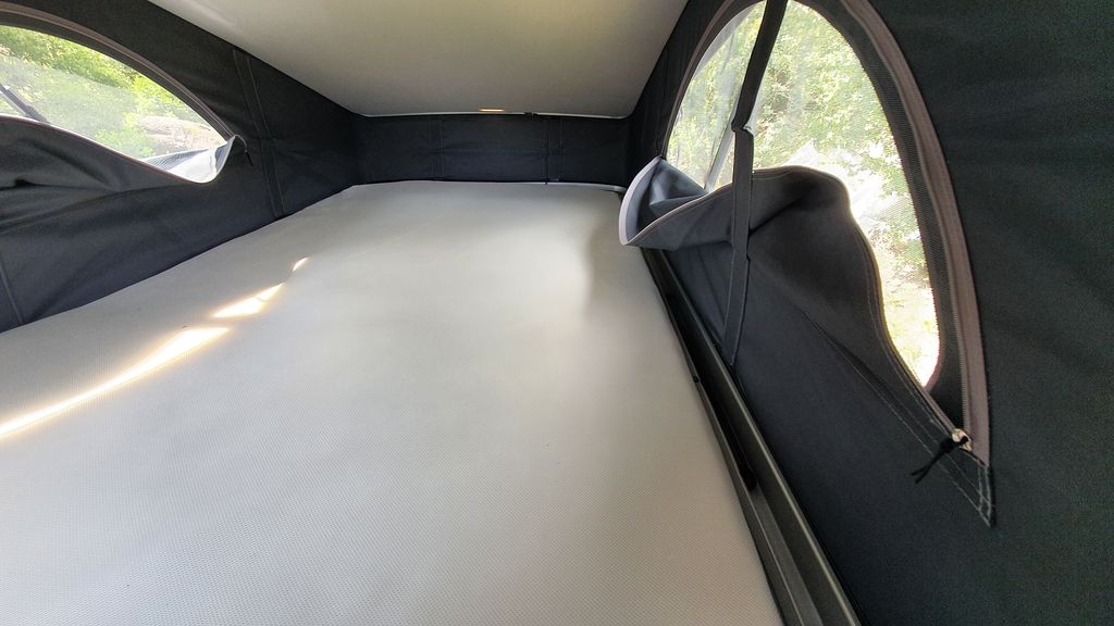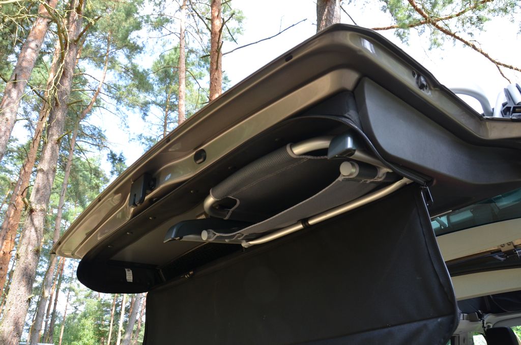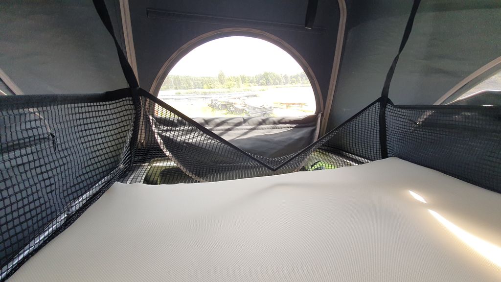 Jeżeli rozłożymy dolne łóżko częściowo, będzie miało długość 160 cm – w przypadku dzieci powinno wystarczyć, a wówczas zostaje nam jeszcze „przestrzeń życiowa” na dole. Jeżeli potrzebujemy więcej miejsca do spania, można rozłożyć łóżko na długość 2 m. Wówczas powinny się na nim zmieścić 3 osoby, ale będą się do siebie musiały przytulać. Jeżeli podróżujemy w dwójkę, lepszym rozwiązaniem wydaje się spanie na antresoli. To opcja, która daje wiele możliwości. Na postoju możemy rozłożyć dach, który utworzy nam na górze namiot. Przy rozłożonym dachu możemy unieść łóżko i w dzień mamy więcej przestrzeni, a na noc możemy łóżko opuścić. Robi się to szybko i prosto, nie potrzeba do tego używać siły, gdyż zajmują się tym siłowniki. Wejście na górę nie powinno nikomu sprawić kłopotu, a materac jest wygodny. Dodatkowo ma się bardzo dobry widok o świcie – oczywiście, jeżeli uda nam się tak wcześnie obudzić.