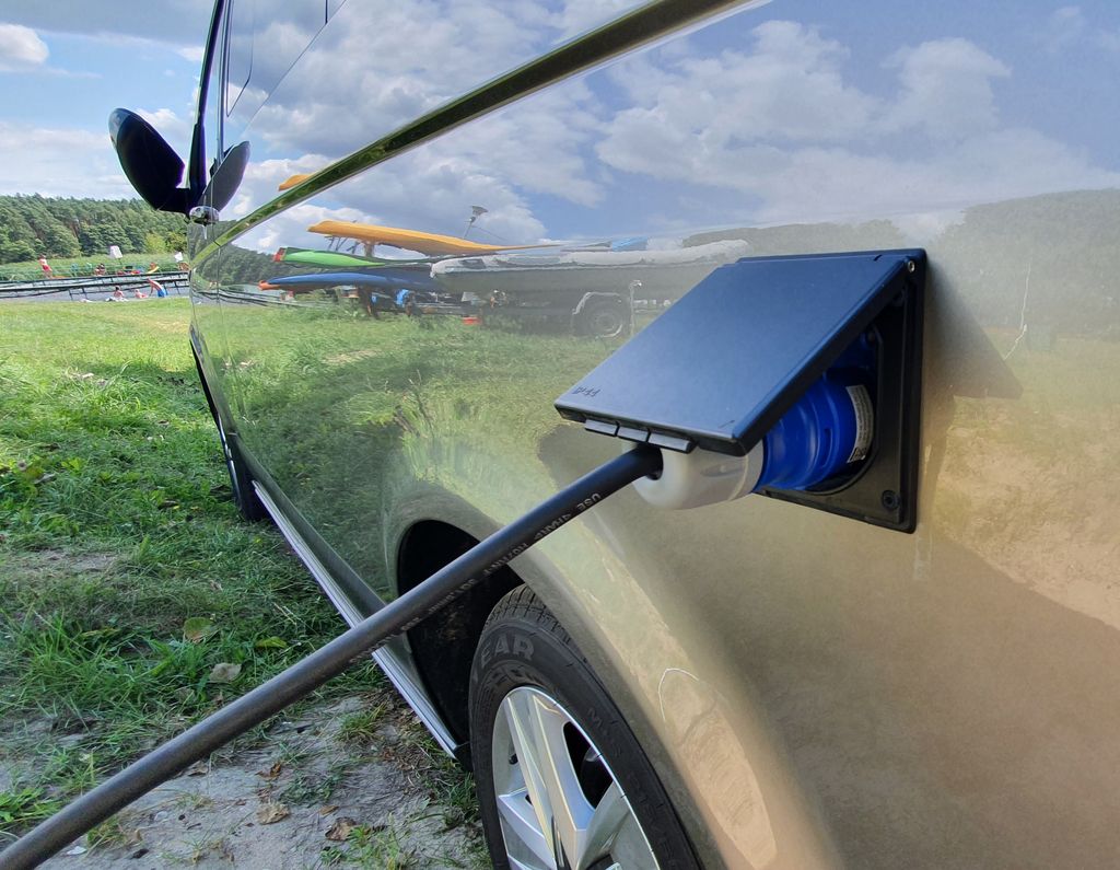 W środku pojazdu, zarówno na dole, jak i na górze, rozmieszczone jest oświetlenie, które działa w trybie kempingowym. Do dyspozycji mamy dwa gniazdka 230 V, gniazda 12 V, USB i USB C, jednak żeby korzystać z elektryczności na postoju, samochód musi być podłączony do źródła prądu.