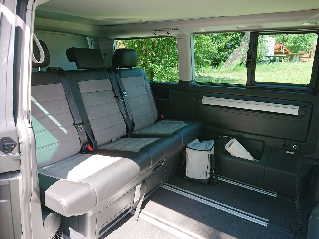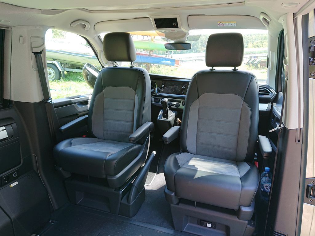 Californią Beach w wersji Camper może podróżować 5 osób. Z przodu są zamontowane dwa niezależne fotele, które na postoju można obrócić w kierunku przeciwnym do jazdy. Z tyłu jest 3-sobowa kanapa, na której są trzy równie wygodne miejsca. Pod kanapą wygospodarowano miejsca na szuflady, do których jest dostęp zarówno ze środka, jak i od strony bagażnika. Cała kanapa jest zamontowana na prowadnicach, więc można ją dowolnie przesuwać. W ten sposób można też sobie regulować miejsce na bagaże.