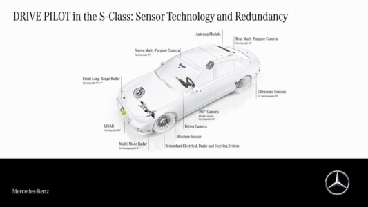 DRIVE PILOT bazuje na czujnikach otoczenia pakietu wspomagania bezpieczeństwa jazdy, ale zawiera też dodatkowe czujniki, które Mercedes-Benz uważa za niezbędne do bezpiecznej, warunkowo zautomatyzowanej jazdy. Należą do nich lidar, a także kamera w tylnej szybie i mikrofony, służące m.in. do wykrywania niebieskich świateł oraz innych specjalnych sygnałów pojazdów uprzywilejowanych, a także czujnik wilgoci w nadkolu. Oprócz danych z czujników DRIVE PILOT otrzymuje informacje o geometrii drogi, profilu trasy, znakach drogowych i nietypowych zdarzeniach drogowych (np. wypadki lub roboty drogowe) z cyfrowej mapy HD. Są one udostępniane i aktualizowane za pośrednictwem połączenia z tzw. zapleczem. Klasa S z opcjonalnym systemem DRIVE PILOT ma również „nadmiarowe” układy kierowniczy i hamulcowy oraz „nadmiarową” pokładową instalację elektryczną, dzięki czemu zachowuje manewrowość nawet w przypadku awarii jednego z układów i pozwala na bezpieczne przejęcie prowadzenia przez kierowcę.