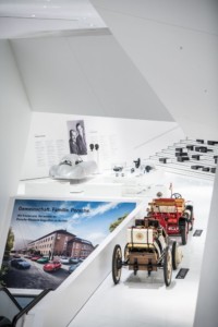 Pierwsza gablota skupia się na życiu i karierze Ferdinanda Porsche. Po zgłębieniu konstrukcji silnika pojazdu elektrycznego inżynier przystąpił do projektowania silników montowanych w piastach kół, a następnie – pierwszego na świecie funkcjonalnego pojazdu w pełni hybrydowego. „Jednym z kamieni milowych w historii firmy jest hybrydyzacja – oraz fakt, że Ferdinand Porsche zaczynał od silników elektrycznych, a nie spalinowych. Silnik montowany w piaście koła to ekscytujący eksponat. Był innowacyjny, ponieważ można było nim sterować” — wyjaśniła kustosz Iris Haker. Lohner-Porsche wywołał spore poruszenie na wystawie światowej, która odbyła się w Paryżu w 1900 r. W tym samym roku Ferdinand Porsche osiągnął nowy poziom technicznego zaawansowania, prezentując Semper Vivus – pierwszy na świecie pojazd w pełni hybrydowy. W celu stworzenia jednostki ładującej do zasilania akumulatorów, a tym samym silników w piastach kół, zastosowano w nim dwa generatory połączone z silnikami benzynowymi.