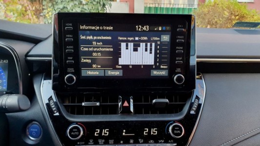 Tablica rozdzielcza jest elegancka. Zastosowane materiały są dobrej jakości, a ich spasowanie bez zarzutu. Po środku znajduje się 8-calowy ekran inforozrywki, na którym można obserwować aktualną pracę układu napędowego, zużycie paliwa i poziom odzysku energii podczas jazdy w ciągu ostatnich 15 minut oraz wyniki spalania z kilku tras. Oczywiście można też podłączyć do systemu telefon za pomocą Bluetootha oraz złącza USB – wówczas mamy dostęp do aplikacji na telefonie.
