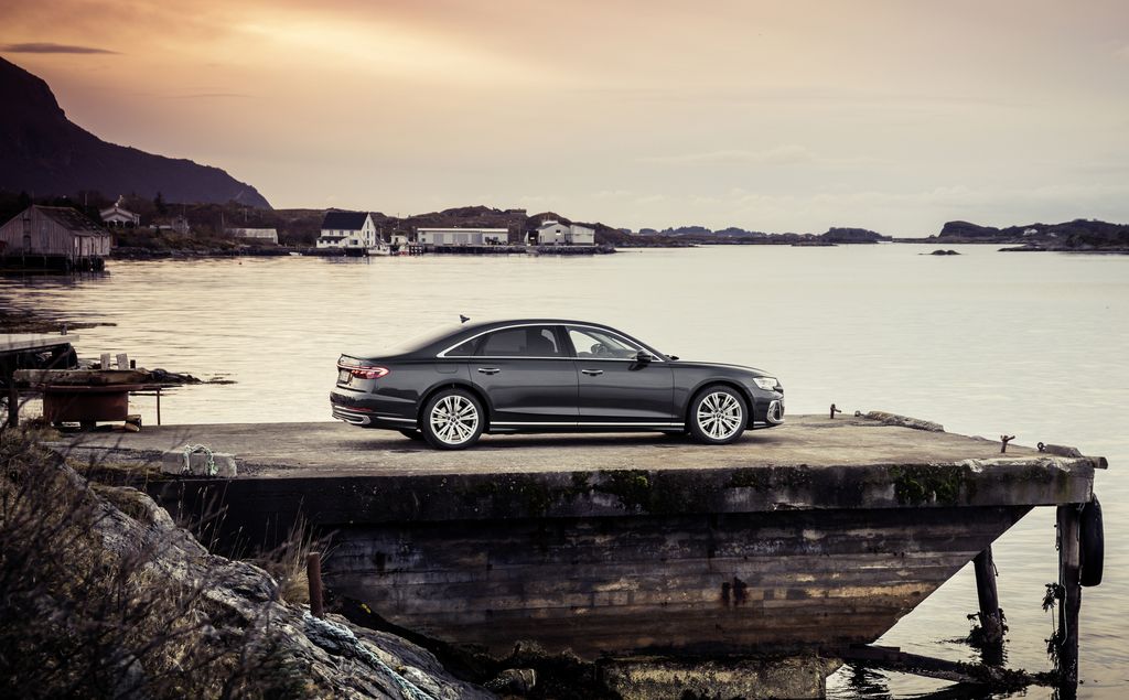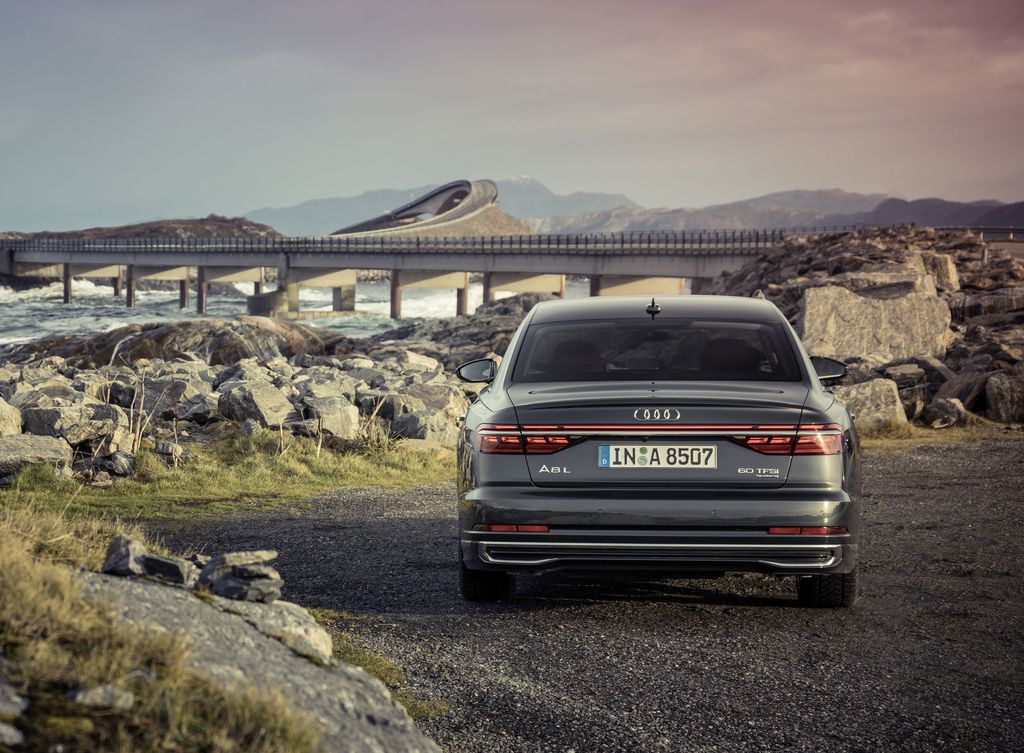 Szczególnie interesująco ta luksusowa limuzyna prezentuje się z boku. Kopuła dachu biegnie płasko. Rozciągnięte linie karoserii podkreślają długość pojazdu, a szerokie nadkola nawiązują do montowanego tu standardowo napędu na cztery koła quattro. We wszystkich wariantach modelu dolna partia drzwi jest wklęsła i zakończona krawędzią skierowaną w stronę drogi. W części tylnej dominują szerokie, chromowane klamry, spersonalizowana sygnatura świateł z cyfrowymi elementami OLED i ciągły, podzielony na segmenty pas świateł. Wkładka dyfuzora z poziomymi przetłoczeniami została zaprojektowana na nowo i delikatnie zaakcentowana. Audi S8 wyposażono w cztery zoptymalizowane pod kątem przepływu spalin rury wydechowe w okrągłych osłonach — to element typowy dla Audi typu S, jeden z charakterystycznych detali sportowej stylistyki auta.