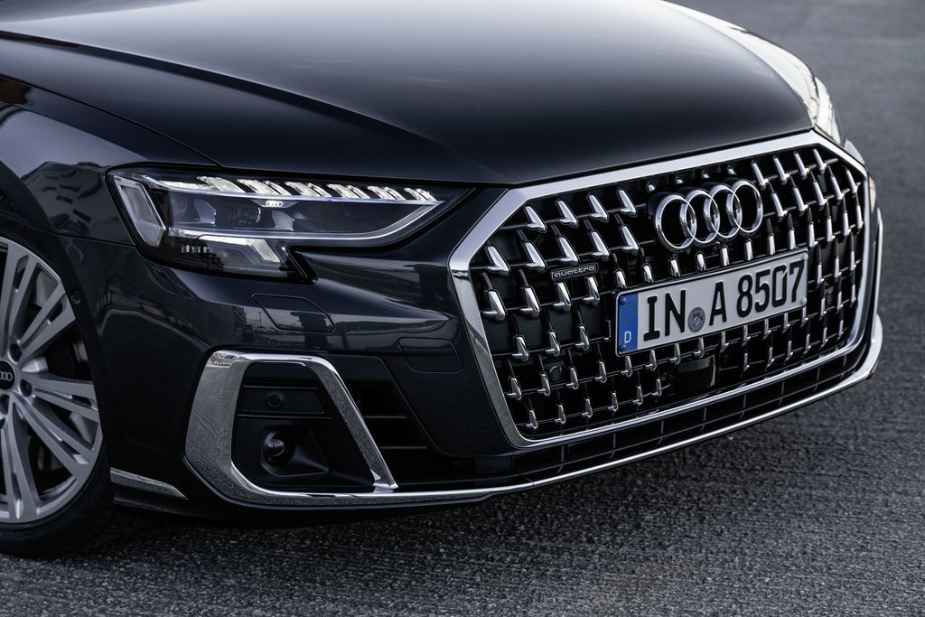 Audi A8 to limuzyna będąca wyrazem wysokiego statusu. Teraz, jej stylistyka zewnętrzna jest jeszcze bardziej reprezentacyjna. Osłona chłodnicy Singleframe jest teraz szersza, a jej grill zdobi chromowana rama rozszerzająca się ku górze. Boczne wloty powietrza są ustawione bardziej pionowo, a ich stylistyka została odświeżona tak samo jak w przypadku reflektorów, których dolna krawędź tworzy teraz wyrazisty kontur po stronie zewnętrznej. Podsumowując: zaprojektowane na nowo i dokładnie spasowane elementy designu przedniej części auta znacząco poprawiają wygląd A8 oraz wyostrzają jego profil.
