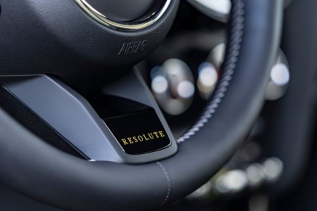 We wnętrzu MINI Cooper SE Resolute Edition do stworzenia typowej dla marki atmosfery frajdy z jazdy przyczyniają się fotele sportowe wykończone tkaniną i skórą ekologiczną w kolorze Black Pearl i Light Chequered, antracytowa podsufitka oraz czarne podłokietniki i ochraniacze kolan. Kierownica sportowa obita skórą Nappa ma na dolnym ramieniu charakterystyczne dla danej edycji logo MINI Resolute. Równomiernie zakrzywione linie w jasnozłotym odcieniu tworzą na powierzchniach wewnętrznych szlachetny wzór w prążki.