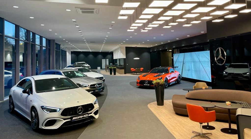 W nowym salonie panuje przytulna, swobodna atmosfera, oparta na koncepcji wielowymiarowości – zamiast typowych stanowisk przestrzeń podzielono na strefy tematyczne. Aranżacja odpowiada założeniom najnowszej strategii sprzedażowej Mercedes-Benz, która jeszcze bardziej skupia się na indywidualnych potrzebach klientów, z naciskiem na doświadczenie luksusu przy zakupie i obsłudze aut oraz na pielęgnowanie długotrwałych, satysfakcjonujących relacji z marką. Spotkania doradców z klientami odbywają się w kameralnych pokojach konsultacyjnych, a do prezentacji samochodów w formie realistycznych wizualizacji służą cyfrowe nośniki – łącznie w salonie wykorzystano ich ponad 20. Wydania samochodów są przeprowadzane w specjalnej strefie o powierzchni 65 m kw., odpowiednio przygotowanej na ten wyjątkowy moment, jakim jest odbiór nowego Mercedesa.