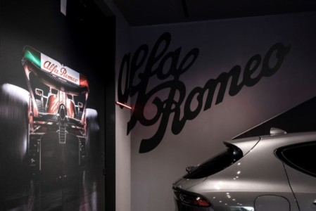 Nowy flagowy salon Alfy Romeo, o nowoczesnym i linearnym wyglądzie, jest prostą, przesiąkniętą technologią przestrzenią, w której dostrzega się silną harmonię pomiędzy tworzącymi ją elementami. Na zewnątrz budynku odwiedzających wita umieszczony na samej górze napis Alfa Romeo- wykonany tradycyjną kursywą – oraz przy wejściu duży, odbijający światło czerwony totem, który koncepcyjnie przyczynia się do stworzenia emocjonalnych wrażeń wizualnych. Klient odbija się w obiekcie reprezentującym wartości marki, tworząc swoistego rodzaju symbiozę pomiędzy „plemieniem” a nową siedzibą Alfa Romeo.