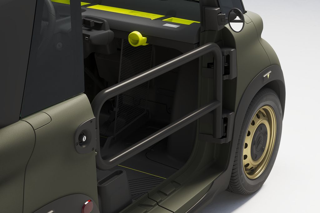 Bliższe spojrzenie i widać brak drzwi i dach, który da się otworzyć, by móc jak najlepiej cieszyć się otoczeniem poza pojazdem, oddychać świeżym powietrzem i poczuć wiatr we włosach. Metalowe rury na zawiasach zastępują drzwi. Jeśli chodzi o składany dach, to jego górna część została wykonana z miękkiego materiału w szarym kolorze, który nawiązuje do modeli Mehari czy 2CV. Tkaninę, z której zrobiony jest dach, można zwinąć. Ma wysoką gęstość, jest wodoodporna i odporna na promienie UV, skutecznie ochroni kierowcę i pasażera przed promieniowaniem słonecznym i gorszymi warunkami pogodowymi. Plandeka jest przymocowana do otworu dachowego za pomocą zatrzasków. Można ją złożyć i w łatwy sposób przechowywać za siedzeniami.
