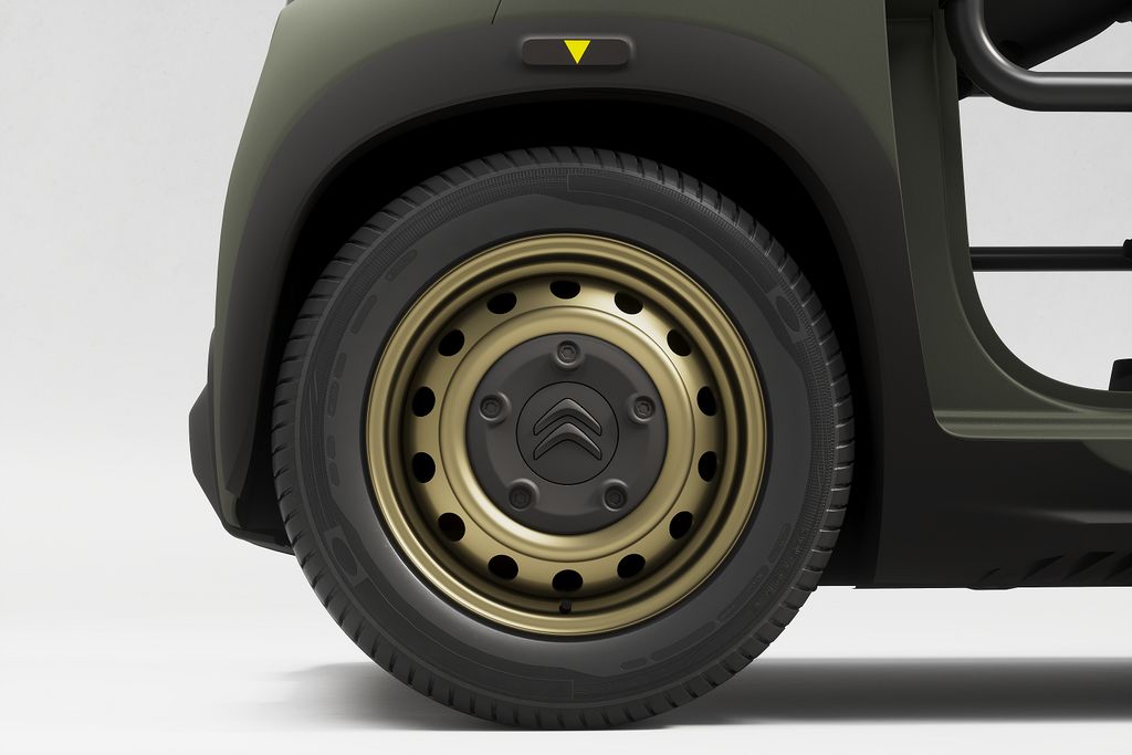 Aby jeszcze bardziej podkreślić swoją osobowość, My Ami Buggy został wyposażony w 14-calowe perforowane złote obręcze kół z czarnymi dekoracyjnymi kołpakami, specjalnie przygotowanymi dla tej wersji. W środku koła znajduje się kultowe logo Citroëna. Taki rodzaj koła o wysokim kolorystycznym kontraście idealnie pasuje do nadwozia w kolorze khaki.