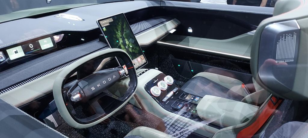Kierowca ma przed sobą wirtualny kokpit z 8,8-calowym ekranem oraz 14,6-calowy ekran systemu multimedialnego. Do dyspozycji są też trzy pokrętła, które służą do zmiany ustawień klimatyzacji oraz ulubionych funkcji. To może oznaczać, że Škoda nie podda się całkowitej cyfryzacji i także w swoich przyszłych modelach zachowa te praktyczne pokrętła. Do wyboru mamy dwie możliwości ustawień – Jazda i Relax. W pierwszym przypadku wyświetlacz multimedialny ustawiony jest wertykalnie. Natomiast z funkcji Relax skorzystamy podczas m.in. ładowania akumulatora. Po naciśnięciu pokrętła znajdującego się na konsoli odsunie się od nas kierownica oraz deska rozdzielcza, dzięki czemu uzyskamy więcej miejsca przed sobą. Nastąpi także zmiana ustawienia przednich foteli. Jednocześnie nastąpi zmiana ustawienia wyświetlacza.