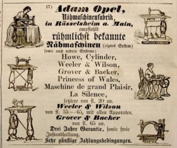 Zmontowanie pierwszej maszyny do szycia zajęło miesiące. Gotowy egzemplarz kupił mistrz krawiecki Hummel z Rüsselsheim, a następnie pracował na nim przez 40 lat. Już wtedy firma działała zgodnie z motto „Niezawodny Opel”. W 1863 r. Opel otworzył pierwszy zakład produkcyjny w nieużywanej oborze należącej do jego wuja. Georg, brat Adama, przysyłał mu z Paryża stal, czółenka, nici i kompletne maszyny do dalszej odsprzedaży. Ukazała się pierwsza reklama produktów firmy, a Adam zatrudnił pierwszego pracownika. Opel nie tylko produkował maszyny do szycia, ale także handlował nimi z dużym powodzeniem.
